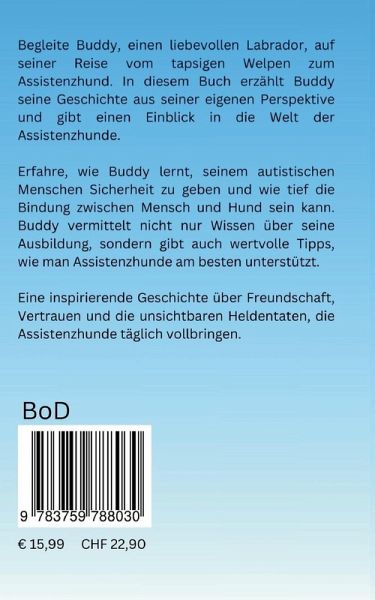Begleite Buddy, einen liebevollen Labrador, auf seiner Reise vom tapsigen Welpen zum Assistenzhund. In diesem Buch erzählt Buddy seine Geschichte aus seiner eigenen Perspektive und gibt einen Einblick in die Welt der Assistenzhunde. Erfahre, wie Buddy lernt, seinem autistischen Menschen Sicherheit zu geben und wie tief die Bindung zwischen Mensch und Hund sein kann. Buddy vermittelt nicht nur Wissen über seine Ausbildung, sondern gibt auch wertvolle Tipps, wie man Assistenzhunde am besten unterstützt. Eine inspirierende Geschichte über Freundschaft, Vertrauen und die unsichtbaren Heldentaten, die Assistenzhunde täglich vollbringen.