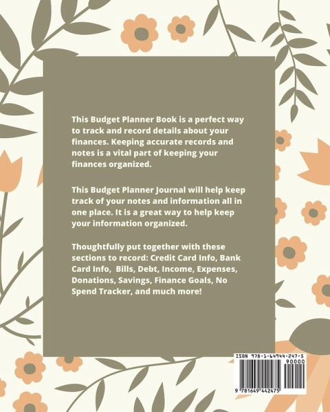 This budget planner book is a perfect way to keep track of your money, organize your bills for the month, keep track of spending and get a personal finance plan in place and help keep you organized. Whether you are planning daily, weekly, monthly or for the calendar year, budgeting has never been so easy to record with this valuable tool. This book contains sections for: Bank Card Information Credit Card Information Savings Account Record Bill Payment Debt Payment Yearly Income Expense Tracker Donation Tracker Checkbook Register Account Tracker Monthly Bill Checklist Savings Trackers Finance Goals No Spend Trackers ¿ Easy to use whether for personal, family or business. Can make a great wedding gift for newly married couples, for Christmas, birthday or any occasion. Large size is 8x10 inches, 76 pages, soft matte finish cover, quality white paper, paperback. Grab one today!
