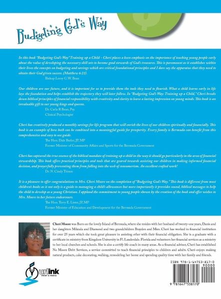 Cheri has creatively produced a monthly savings for life program that will enrich the lives of our children spiritually and financially. This book is an example of how both can be combined into a meaningful guide for prosperity. Every family is Bermuda can benefit from this comprehensive and easy to use guide. ¿ --The Hon. Dale Butler, JP, MP Former Minister of Community Affairs and Sports for the Bermuda Government Cheri has captured the true essence of the biblical mandate of training up a child in the way it should go particularly in the area of financial stewardship. This book offers practical principles and tools that are geared towards assisting our children in making informed financial decision, and prayerfully preventing them from falling into the web of consumerism. An excellent crafted work! --Dr. N. Cindy Trimm It is a pleasure to offer congratulations to Mrs. Cheri Moore on the completion of "Budgeting God's Way." This book is different from most children's books as it not only is a guide to managing a child's allowances but more importantly it provides sound, biblical messages to help the child to develop as a young Christian. I applaud the commitment to young people shown by the creation of the book and offer wishes to Mrs. Moore in her future endeavours. --The Hon. Terry E. Lister, JP, MP Former Minister of Education and Development for the Bermuda Government