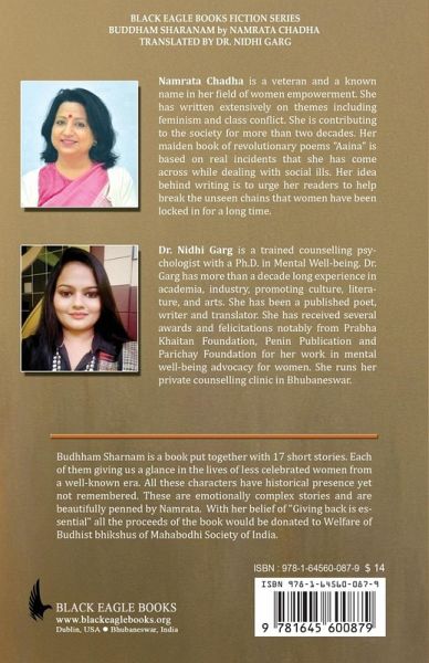 Budhham Sharnam is a book put together with 17 short stories. Each of them giving us a glance in the lives of less celebrated women from a well-known era. All these characters have historical presence yet not remembered. These are emotionally complex stories and are beautifully penned by Namrata. With her belief of "Giving back is essential" all the proceeds of the book would be donated to Welfare of Budhist bhikshus of Mahabodhi Society of India.