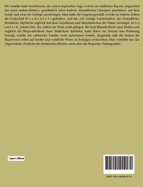 Die Familie hatte beschlossen, die ersten September-Tage, welche im südlichen Bayern, ungeachtet des sonst rauhen Klima's, gewöhnlich einen heitern, freundlichen Charakter annehmen, auf dem Lande und zwar im Gebirge zuzubringen. Man hatte die Gegend gewählt, welche in frühern Zeiten die Grafschaft W e r d e n f e l s geheißen, und die, wie wenige Landschaften, das Freundliche, Heimliche, Idyllische zugleich mit dem Grandiosen und Majestätischen der Natur vereiniget. In G a r m i s c h , einem Orte, der, mitten im Thale wohl gelegen, die freie Räumlichkeit eines Dorfes und zugleich die Bequemlichkeit eines Städtchens darbietet, hatte ihnen ein Freund eine Wohnung besorgt, welche die zahlreiche Familie wohl aufnehmen konnte, dergestalt, daß die Frauen ihr Hauswesen selbst auf leichte und wohlfeile Weise zu besorgen vermochten. Man vermißte nur das Angewohnte, Zierliche des heimischen Herdes, nicht aber das Bequeme, Naturgemäße.