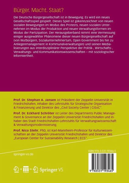 Prof. Dr. Stephan A. Jansen ist Präsident der Zeppelin Universität in Friedrichshafen, Inhaber des Lehrstuhls für Strategische Organisation & Finanzierung und Direktor des "Civil Society Center CiSoC". Prof. Dr. Eckhard Schröter ist Leiter des Departments Public Management & Governance an der Zeppelin Universität Friedrichshafen und Inhaber des Stadt Friedrichshafen-Lehrstuhls für Verwaltungswissenschaft & Verwaltungsmodernisierung. Prof. Nico Stehr, PhD, ist Karl-Mannheim-Professor für Kulturwissenschaftenan der Zeppelin Universität Friedrichshafen und Direktor des "European Center for Sustainability Research ECS".