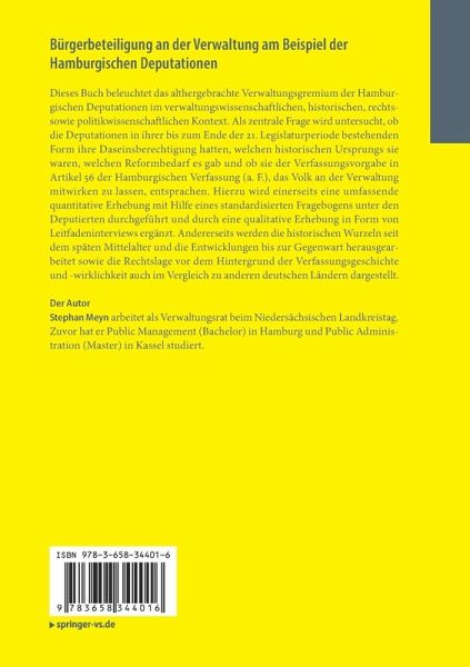 Dieses Buch beleuchtet das althergebrachte Verwaltungsgremium der Hamburgischen Deputationen im verwaltungswissenschaftlichen, historischen, rechts- sowie politikwissenschaftlichen Kontext. Als zentrale Frage wird untersucht, ob die Deputationen in ihrer bis zum Ende der 21. Legislaturperiode bestehenden Form ihre Daseinsberechtigung hatten, welchen historischen Ursprungs sie waren, welchen Reformbedarf es gab und ob sie der Verfassungsvorgabe in Artikel 56 der Hamburgischen Verfassung (a. F.), das Volk an der Verwaltung mitwirken zu lassen, entsprachen. Hierzu wird einerseits eine umfassende quantitative Erhebung mit Hilfe eines standardisierten Fragebogens unter den Deputierten durchgeführt und durch eine qualitative Erhebung in Form von Leitfadeninterviews ergänzt. Andererseits werden die historischen Wurzeln seit dem späten Mittelalter und die Entwicklungen bis zur Gegenwart herausgearbeitet sowie die Rechtslage vor dem Hintergrund der Verfassungsgeschichte und -wirklichkeit auch im Vergleich zu anderen deutschen Ländern dargestellt.