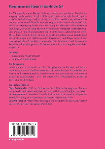 Im Mittelpunkt dieses Bandes steht der soziale und politische Wandel der vergangenen Jahrzehnte. Seit den 1980er Jahren hat das deutsche Parteiensystem massive Veränderungen erlebt, aus dem scheinbar stabilen zweieinhalb Parteiensystem entstand allmählich eine heterogene Mehr-Parteienlandschaft. Die deutsche Vereinigung führte zur Ausweitung des Elektorats auf Bürgerinnen und Bürger, die unter völlig anderen systemischen Vorzeichen sozialisiert wurden. Medien- und Bildungssystem haben umfassende Veränderungen erlebt. Dieses Buch stellt die Frage, ob und in welchem Umfang dieser Wandel auch die Einstellungen und Präferenzen der Bürgerinnen und Bürger umfasst. Aus unterschiedlichen Perspektiven untersuchen die Autorinnen und Autoren den Wandel der Einstellungen und Verhaltensmuster in einer Langfristperspektive empirisch.