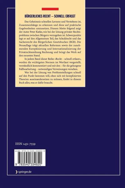 Das Geheimnis schnellen Lernens und Verstehens ist, Zusammenhänge zu erkennen und diese auf praktische Gegebenheiten umzusetzen. Diesem Motto folgend zeigt der Autor Peter Katko, wie bei der Lösung privater Rechtsprobleme zwischen Bürgern vorzugehen ist. Schwerpunkte legt er auf den Allgemeinen Teil, das Schuldrecht und das Sachenrecht des Bürgerlichen Gesetzbuches (BGB). Die Neuauflage trägt aktuellen Reformen sowie der zunehmenden Europäisierung und Internationalisierung der Privatrechtsordnung Rechnung und bringt das Werk auf den neuesten Stand.