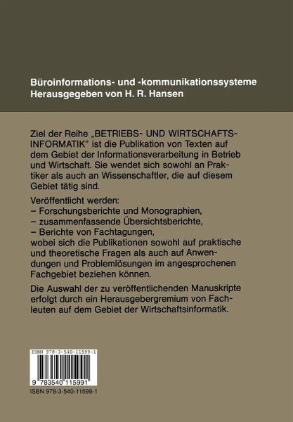 In den Anfangen der kommerziellen Datenverarbeitung wurden Computer weitge hend isoliert vom ubrigen Betriebsgeschehen eingesetzt. F ormalisierbare und damit automatisierbare Aufgaben der Massen- und Routinedatenverarbeitung, vor aHem vergangenheitsorientierte Abrechnungen, wurden aus den Fachabteilungen ausge gliedert und unter der zentralen Verantwortung der EDV -Abteilung verrichtet. Bis gegen das Ende der sechziger Jahre konzentrierte sich dementsprechend das Inter esse von Informatikwissenschaft und Datenverarbeitungspraxis fast ausschlieBlich auf den Computer und sein Betriebssystem. Die…mehr