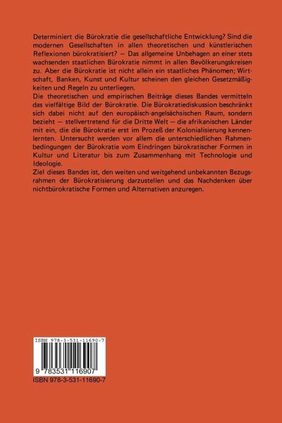 Einleitung: Bürokratisierung als Schicksal? Historische und aktuelle Aspekte und Alternativen.- Gegenüberstellung von Max Webers dualistischem Konzept und Karl Marx' dialektischem Konzept.- Ein Ursprung bürokratischer Werte in Amerika und anderswo. Eine Betrachtung amerikanischer Kenntnisse über die öffentliche Verwaltung und die Übertragung auf Entwicklungsländer.- Bürokratie und öffentliches Leben: die Feminisierung des Gemeinwesens.- Elektronische Datenverarbeitung, Entqualifizierung und Bürokratisierung im Bankensektor. Einige grundlegende Überlegungen.- Überdeterminierte Technologie: Die Delegitimierung einer amerikanischen Ideologie.- Einbahnstraße. Die Produktion einer Bildungs-Kultur: Das Erbe des Formalismus und das Dilemma bürokratischer Bildung.- Bürokratie und Kultur in der modernen Gesellschaft.- Bürokratisches Spiel: Vergleiche über die Kultur des Spiels.- Einige Bemerkungen zur Bürokratisierung der Kultur.- Strukturen und Prozesse in den bürokratischen Staaten des kolonialen Afrika.- Zivile Bürokratie in Afrika nach der Unabhängigkeit. Eine kritische Analyse von Rollenausübung.- Bürokratisierung als Schicksal? Epilog.- Autorenverzeichnis.