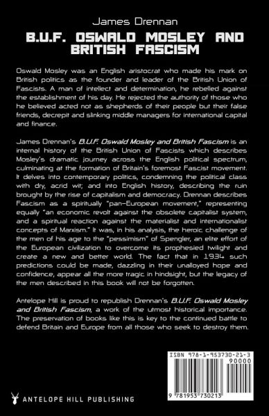 Oswald Mosley was an English aristocrat who made his mark on British politics as the founder and leader of the British Union of Fascists. A man of intellect and determination, he rebelled against the establishment of his day. He rejected the authority of those who he believed acted not as shepherds of their people but their false friends, decrepit and slinking middle managers for international capital and finance. James Drennan's B.U.F. Oswald Mosley and British Fascism is an internal history of the British Union of Fascists which describes Mosley's dramatic journey across the English political spectrum, culminating at the formation of Britain's foremost Fascist movement. It delves into contemporary politics, condemning the political class with dry, acrid wit; and into English history, describing the ruin brought by the rise of capitalism and democracy. Drennan describes Fascism as a spiritually "pan-European movement," representing equally "an economic revolt against the obsolete capitalist system, and a spiritual reaction against the materialist and internationalist concepts of Marxism." It was, in his analysis, the heroic challenge of the men of his age to the "pessimism" of Spengler, an elite effort of the European civilization to overcome its prophesied twilight and create a new and better world. The fact that in 1934 such predictions could be made, dazzling in their unalloyed hope and confidence, appear all the more tragic in hindsight, but the legacy of the men described in this book will not be forgotten.