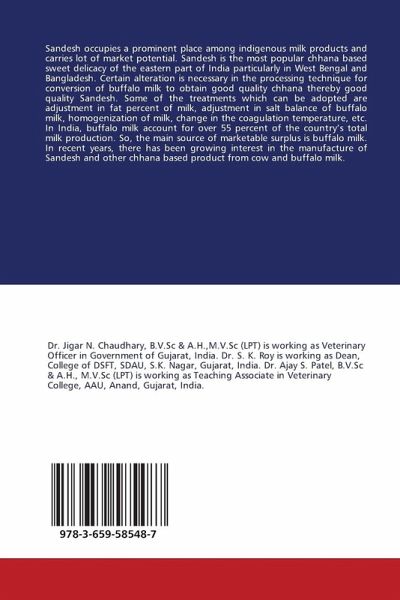 Sandesh occupies a prominent place among indigenous milk products and carries lot of market potential. Sandesh is the most popular chhana based sweet delicacy of the eastern part of India particularly in West Bengal and Bangladesh. Certain alteration is necessary in the processing technique for conversion of buffalo milk to obtain good quality chhana thereby good quality Sandesh. Some of the treatments which can be adopted are adjustment in fat percent of milk, adjustment in salt balance of buffalo milk, homogenization of milk, change in the coagulation temperature, etc. In India, buffalo milk account for over 55 percent of the country's total milk production. So, the main source of marketable surplus is buffalo milk. In recent years, there has been growing interest in the manufacture of Sandesh and other chhana based product from cow and buffalo milk.