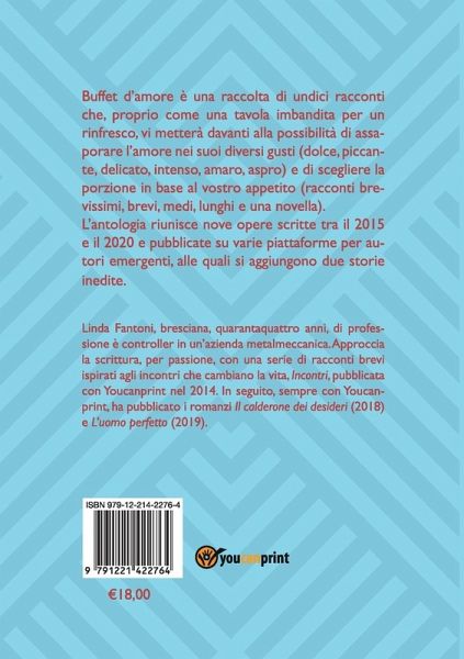 Buffet d'amore è una raccolta di undici racconti che, proprio come una tavola imbandita per un rinfresco, vi metterà davanti alla possibilità di assaporare l'amore nei suoi diversi gusti (dolce, piccante, delicato, intenso, amaro, aspro) e di scegliere la porzione in base al vostro appetito (racconti brevissimi, brevi, medi, lunghi e una novella).L'antologia riunisce nove opere scritte tra il 2015 e il 2020 e pubblicate su varie piattaforme per autori emergenti, alle quali si aggiungono due storie inedite.