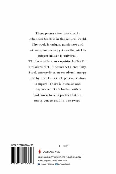 These poems show how deeply imbedded Stock is in the natural world. The work is unique, passionate and intimate; accessible, yet intelligent. His subject matter is universal. The book offers an exquisite buffet for a reader's diet. It buzzes with creativity. Stock extrapolates an emotional energy line by line. His use of personification is superb. There is humour and playfulness. Don't bother with a bookmark; here is poetry that will tempt you to read in one sweep.