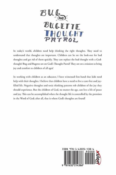 In today's world, children need help thinking the right thoughts. They need to understand that thoughts are important. Children can be on the look-out for bad thoughts and get rid of them quickly. They can replace the bad thought with a God-thought! Bug and Bugette are on God's Thought Patrol! They are on a mission to bring joy and comfort to children of all ages!In working with children as an educator, I have witnessed first-hand that kids need help with their thoughts. I believe that children have a need to live a care-free and joy-filled life. Negative thoughts and toxic thinking patterns rob children of the joy they should experience. But the children of God, no matter the age, can live a life of peace and joy. This can be accomplished when the thought life is controlled by the promises in the Word of God; after all, that is where God's thoughts are found!