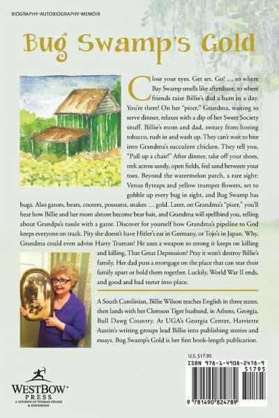 Close your eyes. Get set. Go! to where Bay Swamp smells like aftershave, to where friends raise Billie's dad a barn in a day. You're there! On her "pizer," Grandma, waiting to serve dinner, relaxes with a dip of her Sweet Society snuff. Billie's mom and dad, sweaty from hoeing tobacco, rush in and wash up. They can't wait to bite into Grandma's succulent chicken. They tell you, "Pull up a chair!" After dinner, take off your shoes, trek across sandy, open fields, feel sand between your toes. Beyond the watermelon patch, a rare sight: Venus flytraps and yellow trumpet flowers, set to gobble up every bug in sight, and Bug Swamp has bugs. Also gators, bears, cooters, possums, snakes gold. Later, on Grandma's "pizer," you'll hear how Billie and her mom almost become bear bait, and Grandma will spellbind you, telling about Grandpa's tussle with a gator. Discover for yourself how Grandma's pipeline to God keeps everyone on track. Pity she doesn't have Hitler's ear in Germany, or Tojo's in Japan. Why, Grandma could even advise Harry Truman! He uses a weapon so strong it keeps on killing and killing. That Great Depression? Pray it won't destroy Billie's family. Her dad puts a mortgage on the place that can tear their family apart or hold them together. Luckily, World War II ends, and good and bad teeter into place.