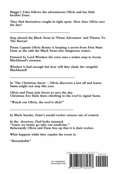 Bugga's Tales, a collection of short stories, follows the adventurous Olivia and her little brother Dane. Step aboard the Black Swan in Pirate Adventure and Pirates To The Rescue. Pirate Captain Olivia Bonny is keeping a secret from First Mate Dane as she sails the Black Swan into dangerous waters. Pursued by Lord Windsor the crew uses a stolen map to locate Blackbeard's treasure. Lord Windsor is bad enough,but how will they elude the vengeful Blackbeard? In The Christmas Snow, Olivia discovers a lost elf and learns Santa might not stop this year. Olivia and Dane join forces to save the day. Christmas Eve finds them climbing to the roof to signal Santa. "Watch out Olivia, the roof is slick!" In Black Smoke, Dane's model rocket careens out of control. In the doorway, Dad looks steamed. "Guess we better go take our medicine." Olivia and Dane fess up that it is their rocket. What happens while they repaint the room is "Remarkable"