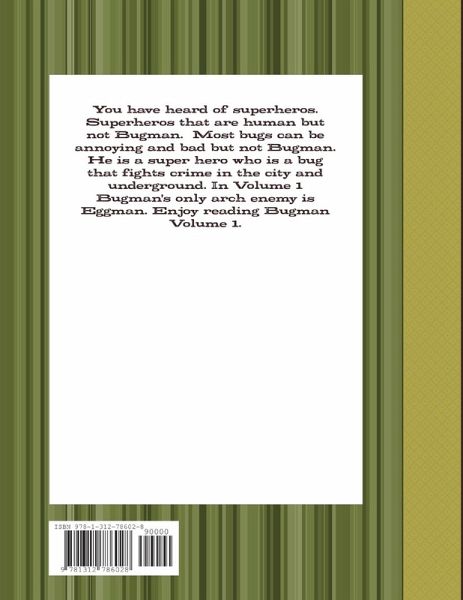 You have heard of superheros. Superheros that are human but not Bugman. Most bugs can be annoying but not Bugman. Bugman is a superhero who is a bug that fights crime in the city and underground. In Volume 1 Bugmans only arch enemy is Eggman. I hope you enjoy reading Bugman Volume 1. Visit Bugman's website for more Bugman: bugman.simdif.com Original Release Date: (January 2016)