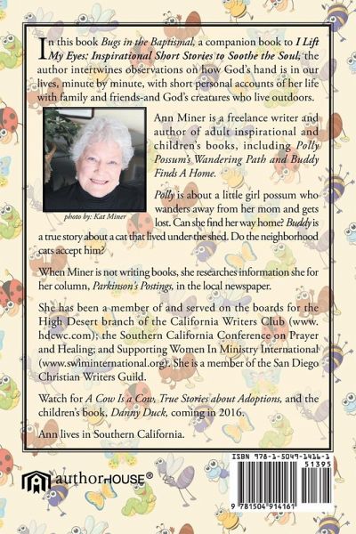 In this book Bugs in the Baptismal, a companion book to I Lift My Eyes: Inspirational Short Stories to Soothe the Soul, the author intertwines observations on how God's hand is in our lives, minute by minute, with short personal accounts of her life with family and friends-and God's creatures who live outdoors.