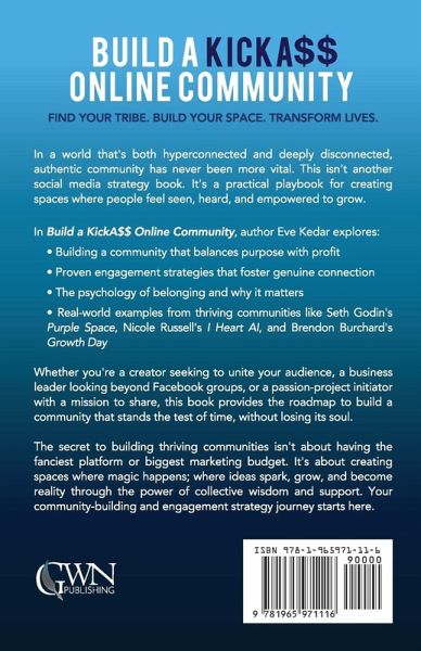 FIND YOUR TRIBE. BUILD YOUR SPACE. TRANSFORM LIVES. In a world that's both hyperconnected and deeply disconnected, authentic community has never been more vital. This isn't another social media strategy book. It's a practical playbook for creating spaces where people feel seen, heard, and empowered to grow. In Build a KickA$$ Online Community, author Eve Kedar explores: Building a community that balances purpose with profit Proven engagement strategies that foster genuine connection The psychology of belonging and why it matters Real-world examples from thriving communities like Seth Godin's Purple Space, Nicole Russell's I Heart AI, and Brendon Burchard's Growth Day Whether you're a creator seeking to unite your audience, a business leader looking beyond Facebook groups, or a passion-project initiator with a mission to share, this book provides the roadmap to build a community that stands the test of time, without losing its soul. The secret to building thriving communities isn't about having the fanciest platform or biggest marketing budget. It's about creating spaces where magic happens; where ideas spark, grow, and become reality through the power of collective wisdom and support. Your community-building and engagement strategy journey starts here.