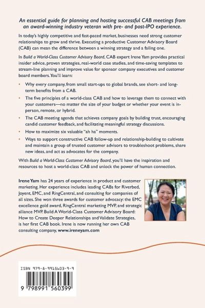 In today's highly competitive and fast-paced market, businesses need strong customer relationships to grow and thrive. Executing a productive Customer Advisory Board (CAB) can mean the difference between a winning strategy and a failing one. In Build a World-Class Customer Advisory Board, CAB expert Irene Yam provides practical insider advice, proven strategies, real-world case studies, and time-saving templates to streamline planning and improve value for sponsor company executives and customer board members. You'll learn: Why every company, from small start-ups to global brands, see short- and long-term benefits from a CAB. The five principles of a world-class CAB and how to leverage them to connect with your customers-no matter the size of your budget or whether your event is in-person, remote, or hybrid. The CAB meeting agenda that achieves company goals by building trust, encouraging candid customer feedback, and facilitating meaningful strategy discussions. How to maximize six valuable "aha" moments. Ways to support constructive CAB follow-up and relationship-building to cultivate and maintain a group of trusted customer advisors to troubleshoot problems, share new ideas, and act as advocates for the company. With Build a World-Class Customer Advisory Board, you'll have the inspiration and resources to host a world-class CAB and unlock the power of human connection.
