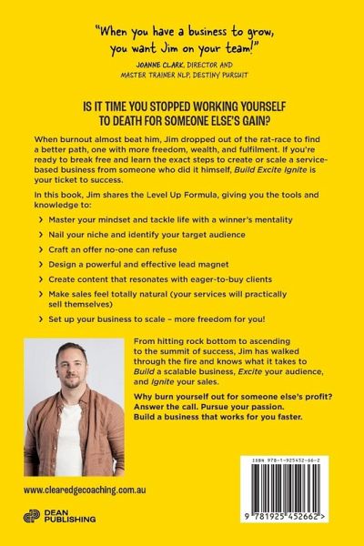Is it time you stopped working yourself to death for someone else's gain? When burnout almost beat him, Jim dropped out of the rat-race to find a better path, one with more freedom, wealth, and fulfilment. If you're ready to break free and learn the exact steps to create or scale a service-based business from someone who did it himself, Build Excite Ignite is your ticket to success. In this book, Jim shares the Level Up Formula, giving you the tools and knowledge to:Master your mindset and tackle life with a winner's mentality Nail your niche and identify your target audience Craft an offer no-one can refuse Design a powerful and effective lead magnet Create content that resonates with eager-to-buy clients Make sales feel totally natural (your services will practically sell themselves) Set up your business to scale - more freedom for you! From hitting rock bottom to ascending to the summit of success, Jim has walked through the fire and knows what it takes to Build a scalable business, Excite your audience, and Ignite your sales. Why burn yourself out for someone else's profit? Answer the call. Pursue your passion. Build a business that works for you faster.