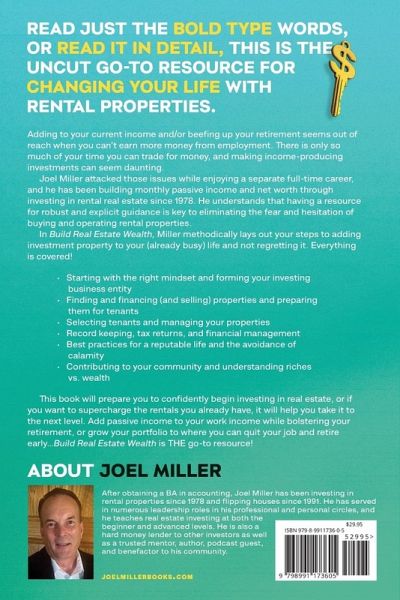 Read Just The Bold Type Words, Or Read It In Detail, This Is The Uncut Go-To Resource For Changing Your Life With Rental Properties. Adding to your current income and/or beefing up your retirement seems out of reach when you can't earn more money from employment. There is only so much of your time you can trade for money, and making income-producing investments can seem daunting. Joel Miller attacked those issues while enjoying a separate full-time career, and he has been building monthly passive income and net worth through investing in rental real estate since 1978. He understands that having a resource for robust and explicit guidance is key to eliminating the fear and hesitation of buying and operating rental properties. In Build Real Estate Wealth, Miller methodically lays out your steps to adding investment property to your (already busy) life and not regretting it. Everything is covered! ¿ Starting with the right mindset and forming your investing business entity ¿ Finding and financing (and selling) properties and preparing them for tenants ¿ Selecting tenants and managing your properties ¿ Record keeping, tax returns, and financial management ¿ Best practices for a reputable life and the avoidance of calamity ¿ Contributing to your community and understanding riches vs. wealth This book will prepare you to confidently begin investing in real estate, or if you want to supercharge the rentals you already have, it will help you take it to the next level. Add passive income to your work income while bolstering your retirement, or grow your portfolio to where you can quit your job and retire early...Build Real Estate Wealth is THE go-to resource!
