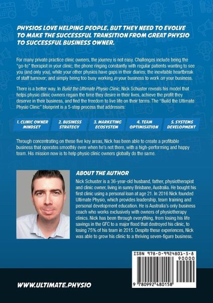 Physios love helping people, but they need to evolve to make the successful transition from great physio to successful business owner. For many private practice clinic owners, the journey is not easy. Challenges include being the "go-to" therapist in your clinic; the phone ringing constantly with regular patients wanting to see you (and only you), while your other physios have gaps in their diaries; the inevitable heartbreak of staff turnover; and simply being too busy working in your business to work on your business. There is a better way. In Build the Ultimate Physio Clinic, Nick Schuster reveals his model that helps physio clinic owners regain the time they desire in their lives, achieve the profit they deserve in their business, and find the freedom to live life on their terms. The "Build the Ultimate Physio Clinic" blueprint is a 5-step process that addresses: Clinic owner mindset Business strategy Marketing ecosystem Team optimisation System development Through concentrating on these five key areas, Nick has been able to create a profitable business that operates smoothly even when he's not there, with a high-performing and happy team. His mission now is to help physio clinic owners globally do the same.