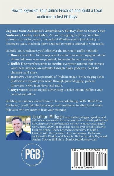 Capture Your Audience's Attention: A 60-Day Plan to Grow Your Audience, Leads, and Sales Are you struggling to grow your online presence as a writer, coach, or speaker? Do you want to attract more leads and boost your sales? Look no further! "Build Your Audience" is your ultimate guide to mastering the art of audience growth in just 60 days. In this fourth installment of the Your Message Matters Series, you'll discover proven strategies to build a loyal following and establish your brand online. Whether you're just starting or looking to scale, this book offers actionable insights tailored to your needs. What You'll Discover: The Power of an Email List: Understand why building an email list is crucial for your success and how to effectively grow and engage your subscribers. The Four Types of Online Traffic:Boost: Learn how to leverage social media to increase engagement and attract followers who are genuinely interested in your message. Build: Discover the secrets to creating evergreen content that attracts your ideal audience on autopilot through blogs, podcasts, YouTube channels, and more. Borrow: Uncover the potential of "hidden stages" by leveraging other platforms to expand your reach through guest blogging, podcast interviews, video interviews, and more. Buy: Master the art of paid advertising to drive instant traffic to your content and offers. Why This Book?Step-by-Step Guide: Follow a clear, 60-day plan to steadily grow your audience with practical, easy-to-implement steps. Proven Strategies: Benefit from tactics that have helped countless writers, coaches, and speakers achieve online success. Comprehensive Approach: Covering everything from social media engagement to paid advertising, this playbook leaves no stone unturned. Building an audience doesn't have to be overwhelming. With "Build Your Audience," you'll gain the knowledge and confidence to attract and retain followers who are eager to hear your message. Start your journey today and watch your influence grow!