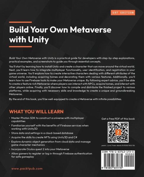 Unlock the power of creating your own multiplayer virtual world and explore infinite possibilities by following practical examples on building, designing, and implementing various features in this part-color guide Key Features: Create your own Metaverse from scratch with detailed and practical instructions Use Firebase tools to create a distinctive and feature-rich virtual world Compile and distribute the finished project to various platforms Purchase of the print or Kindle book includes a free PDF eBook Book Description: Build Your Own Metaverse with Unity is a practical guide for developers with step-by-step explanations, practical examples, and screenshots to guide them through essential concepts. You'll start by learning how to install Unity and create a character that can move around the virtual world. Next, you'll learn how to integrate multiplayer functionality, user identification, and registration in your game universe. You'll explore how to create interactive characters dealing with different attributes of the virtual world, including acquiring homes and decorating them with various features. Additionally, you'll understand how to use Firebase tools to make your Metaverse unique. By following the expert advice, you'll be able to create a feature rich Metaverse where players can interact with NPCs, acquire homes, and interact with other players online. Finally, you'll discover how to compile and distribute the finished project to various platforms, while acquiring with necessary skills and knowledge to create a unique and groundbreaking Metaverse. By the end of this book, you'll be well-equipped to create a Metaverse with infinite possibilities. What You Will Learn: Master Photon SDK to construct a universe with multiplayer capabilities Familiarize yourself with the benefits of Firebase services when working with Unity3D Store data and settings in a cloud-based database Acquire the skills to create NFTs using Unity3D and C# Explore dynamic object generation from cloud data and manage game character mechanics Incorporate Oculus quest 2 into your Metaverse Allow gamers to register or log in through Firebase authentication for safe gameplay Who this book is for: This book is perfect for beginners as well as seasoned game developers alike. With its help, you'll learn valuable skills in idea planning, construction, compilation, and distribution, ensuring a holistic understanding of metaverse development.