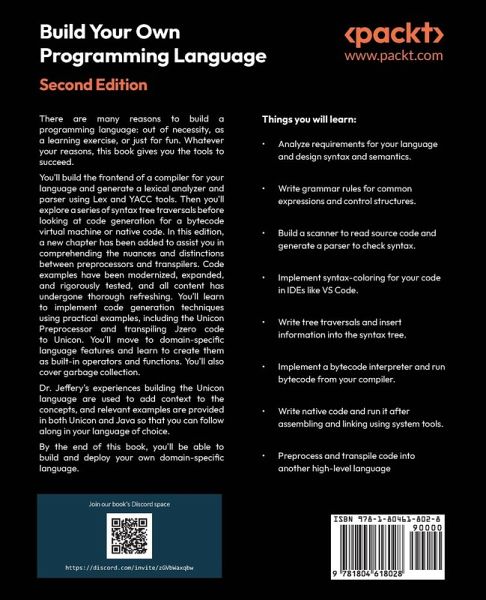 Learn to design your own programming language in a hands-on way by building compilers, using preprocessors, transpilers, and more, in this fully-refreshed second edition, written by the creator of the Unicon programming language. Purchase of the print or Kindle book includes a free PDF eBook Key Features - Takes a hands-on approach; learn by building the Jzero language, a subset of Java, with example code shown in both the Java and Unicon languages - Learn how to create parsers, code generators, scanners, and interpreters - Target bytecode, native code, and preprocess or transpile code into a high-level language Book Description There are many reasons to build a programming language: out of necessity, as a learning exercise, or just for fun. Whatever your reasons, this book gives you the tools to succeed. You'll build the frontend of a compiler for your language and generate a lexical analyzer and parser using Lex and YACC tools. Then you'll explore a series of syntax tree traversals before looking at code generation for a bytecode virtual machine or native code. In this edition, a new chapter has been added to assist you in comprehending the nuances and distinctions between preprocessors and transpilers. Code examples have been modernized, expanded, and rigorously tested, and all content has undergone thorough refreshing. You'll learn to implement code generation techniques using practical examples, including the Unicon Preprocessor and transpiling Jzero code to Unicon. You'll move to domain-specific language features and learn to create them as built-in operators and functions. You'll also cover garbage collection. Dr. Jeffery's experiences building the Unicon language are used to add context to the concepts, and relevant examples are provided in both Unicon and Java so that you can follow along in your language of choice. By the end of this book, you'll be able to build and deploy your own domain-specific language. What you will learn - Analyze requirements for your language and design syntax and semantics. - Write grammar rules for common expressions and control structures. - Build a scanner to read source code and generate a parser to check syntax. - Implement syntax-coloring for your code in IDEs like VS Code. - Write tree traversals and insert information into the syntax tree. - Implement a bytecode interpreter and run bytecode from your compiler. - Write native code and run it after assembling and linking using system tools. - Preprocess and transpile code into another high-level language Who this book is for This book is for software developers interested in the idea of inventing their own language or developing a domain-specific language. Computer science students taking compiler design or construction courses will also find this book highly useful as a practical guide to language implementation to supplement more theoretical textbooks. Intermediate or better proficiency in Java or C++ programming languages (or another high-level programming language) is assumed.