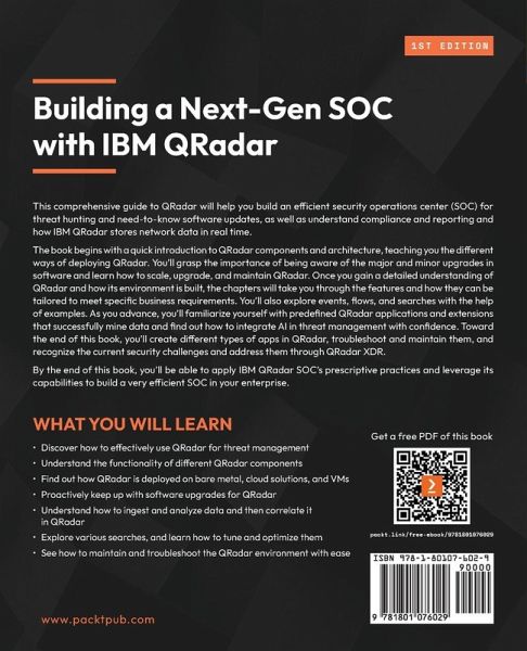 Discover how different QRadar components fit together and explore its features and implementations based on your platform and environment Purchase of the print or Kindle book includes a free PDF eBook Key Features:Get to grips with QRadar architecture, components, features, and deployments Utilize IBM QRadar SIEM to respond to network threats in real time Learn how to integrate AI into threat management by using QRadar with Watson Book Description: This comprehensive guide to QRadar will help you build an efficient security operations center (SOC) for threat hunting and need-to-know software updates, as well as understand compliance and reporting and how IBM QRadar stores network data in real time. The book begins with a quick introduction to QRadar components and architecture, teaching you the different ways of deploying QRadar. You'll grasp the importance of being aware of the major and minor upgrades in software and learn how to scale, upgrade, and maintain QRadar. Once you gain a detailed understanding of QRadar and how its environment is built, the chapters will take you through the features and how they can be tailored to meet specifi c business requirements. You'll also explore events, flows, and searches with the help of examples. As you advance, you'll familiarize yourself with predefined QRadar applications and extensions that successfully mine data and find out how to integrate AI in threat management with confidence. Toward the end of this book, you'll create different types of apps in QRadar, troubleshoot and maintain them, and recognize the current security challenges and address them through QRadar XDR. By the end of this book, you'll be able to apply IBM QRadar SOC's prescriptive practices and leverage its capabilities to build a very efficient SOC in your enterprise. What You Will Learn:Discover how to effectively use QRadar for threat management Understand the functionality of different QRadar components Find out how QRadar is deployed on bare metal, cloud solutions, and VMs Proactively keep up with software upgrades for QRadar Understand how to ingest and analyze data and then correlate it in QRadar Explore various searches, and learn how to tune and optimize them See how to maintain and troubleshoot the QRadar environment with ease Who this book is for: This book is for security professionals, SOC analysts, security engineers, and any cybersecurity individual looking at enhancing their SOC and SIEM skills and interested in using IBM QRadar to investigate incidents in their environment to provide necessary security analytics to responsible teams. Basic experience with networking tools and knowledge about cybersecurity threats is necessary to grasp the concepts present in this book.