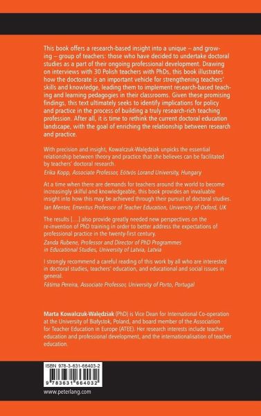 Kowalczuk-Waledziak's book offers a timely and well-designed research study into the challenges, rewards, doubts, and successes experienced by teachers who continue their professional development through PhD studies. The results, vividly illustrated by quotes directly from interviews, dot every 'i' in the discussion about the value of training teachers in academic research practices. They also provide greatly needed new perspectives on the re-invention of PhD training in order to better address the expectations of professional practice in the twenty-first century.