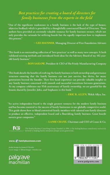 "One of the significant weaknesses in a family business is the lack of the type of honest, objective feedback which is provided by a thoughtfully constructed Board of Directors. These authors have provided an extremely valuable resource for family business owners which not only provides the rational for utilizing boards but the equally important "how to" implement this process." - Lee Hausner, Managing Director First Foundation Advisors
