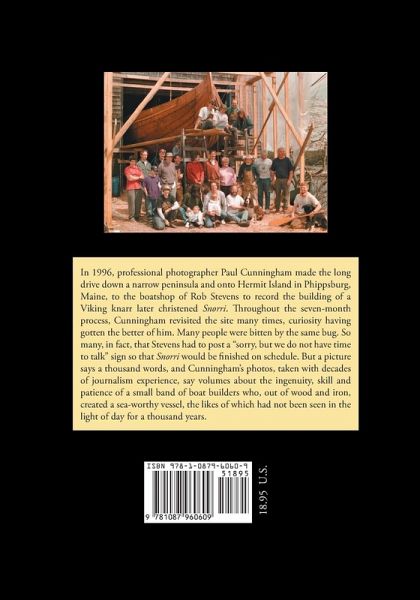 In 1996, professional photographer Paul Cunningham made the long drive down a narrow peninsula and onto Hermit Island in Phippsburg, Maine, to the boat shop of Rob Stevens to record the building of a Viking knarr later christened Snorri. Throughout the seven-month process, Cunningham revisited the site many times, curiosity having gotten the better of him. Many people were bitten by the same bug. So many, in fact, that Stevens had to post a "sorry, but we do not have time to talk" sign so that Snorri would be finished on schedule. But a picture says a thousand words, and Cunningham's photos, taken with decades of journalism experience, say volumes about the ingenuity, skill, and patience of a small band of boat builders who, out of wood and iron, created a sea-worthy vessel, the likes of which had not been seen in the light of day for a thousand years.