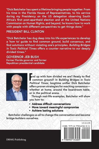 Fed up with how divided we are? Ready to find common ground? In Building Bridges in Toxic Political Times, longtime unifier Dick Batchelor offers proven strategies for reaching consensus-whether at home, around the boardroom table, or in the political arena. Through real-life examples, Batchelor will show you how to: * Address difficult conversations * Move toward meaningful compromise * Achieve lasting solutions Batchelor challenges us all to change the conversation and become bridge-builders ourselves.
