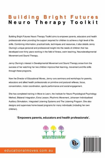 Building Bright Futures Neuro Therapy Toolkit aims to empower parents, educators and health professionals when providing the support required for children to achieve a high level of life skills. Combining information, practical tools, techniques and resources, it also details Jenny Cluning's unique personal and professional insight into the needs of children that has developed over thirty years working in the field of fitness, swim teaching, Neurodevelopmental Movement and Sound Therapy.