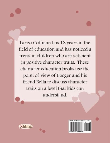 Larisa Coffman has 18 years in the field of education and has noticed a trend in children who are deficient in positive character traits. These character education books use the point of view of Booger and his friend Bella to discuss character traits on a level that kids can understand.