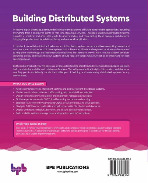 DESCRIPTION In today's digital landscape, distributed systems are the backbone of scalable and reliable applications, powering everything from e-commerce giants to real-time streaming services. This book, Building Distributed Systems, provides a practical and accessible guide to understanding and constructing these complex architectures, bridging the gap between foundational theory and real-world application. In this book, we will dive into the fundamentals of distributed systems, understand how computing evolved and what are some critical aspects of these systems that software architects and engineers must always be aware of to help them make design and implementation decisions. Furthermore, we will learn to make tradeoff decisions grounded on key objectives that our systems should focus on versus what may not be so important for each specific use case. By the end of this book, you will possess a strong understanding of distributed systems and be equipped to design, build, and deploy scalable and reliable applications. You will gain practical insights into modern architectures, enabling you to confidently tackle the challenges of building and maintaining distributed systems in any environment. WHAT YOU WILL LEARN ¿ Architect microservices, implement caching, and deploy resilient distributed systems. ¿ Master event-driven patterns, traffic routing, and cloud platform selection. ¿ Design for consistency, availability, and implement robust data strategies. ¿ Optimize performance via CI/CD, load balancing, and advanced caching. ¿ Engineer fault-tolerant systems using CQRS, circuit breakers, and cloud services. ¿ Navigate CAP theorem trade-offs and build observable distributed architectures. WHO THIS BOOK IS FOR This book is for software engineers, architects, and computer science students eager to build scalable internet systems. A basic understanding of software design principles is beneficial for those seeking practical, real-world implementations.
