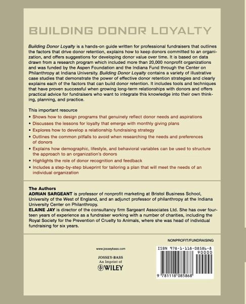 "Building Donor Loyalty" is a hands-on guide written for professional fundraisers that outlines the factors that drive donor retention, explains how to keep donors committed to an organization, and offers suggestions for developing donor value over time. It is based on data drawn from a research program which included more than 20,000 nonprofit organizations and was funded by the Aspen Foundation and the Indiana Fund through the Center on Philanthropy at Indiana University. "Building Donor Loyalty" contains a variety of illustrative case studies that demonstrate the power of effective donor retention strategies and clearly explains each of the factors that can build donor retention. It includes tools and techniques that have proven successful when growing long-term relationships with donors and offers practical advice for fundraisers who want to integrate this knowledge into their own thinking, planning, and practice.