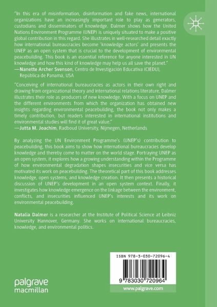 By analyzing the UN Environment Programme's (UNEP's) contribution to peacebuilding, this book aims to show how international bureaucracies develop knowledge and thereby come to matter on the world stage. Portraying UNEP as an open system, it explores how a growing understanding within the Programme of how environmental degradation shapes insecurities and vice versa has motivated its work on peacebuilding. The theoretical part of this book addresses knowledge, open systems, and knowledge creation. It then presents a historical discussion of UNEP's development in an open system context. Finally, it investigates how knowledge emergence on the linkage between the environment, conflicts, and insecurities influenced UNEP's interests and its work on environmental peacebuilding.