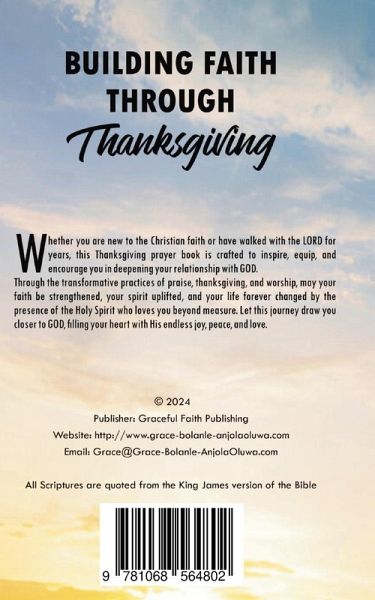 Building Faith Through Thanksgiving is perfect for daily devotion, and personal, group, and family prayer sessions. This thanksgiving prayer book is crafted to inspire, equip, and encourage you in deepening your relationship with GOD. This book will strengthen your Faith in GOD, through the transformative practices of praise, thanksgiving, and worship.