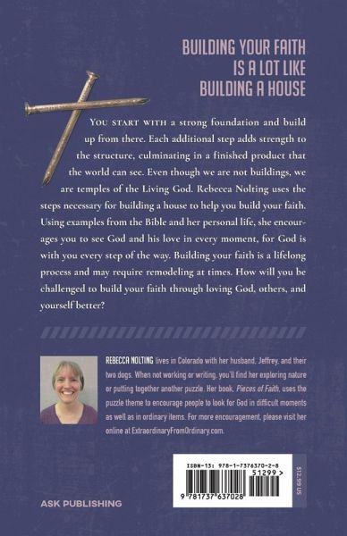 Building your faith is a lot like building a house. You start with a strong foundation and build up from there. Each additional step adds strength to the structure, culminating in a finished product that the world can see. Even though we are not buildings, we are temples of the Living God. Rebecca Nolting uses the steps necessary for building a house to help you build your faith. Using examples from the Bible and her personal life, she encourages you to see God and his love in every moment, for God is with you every step of the way. Building your faith is a lifelong process and may require remodeling at times. How will you be challenged to build your faith through loving God, others and yourself better?
