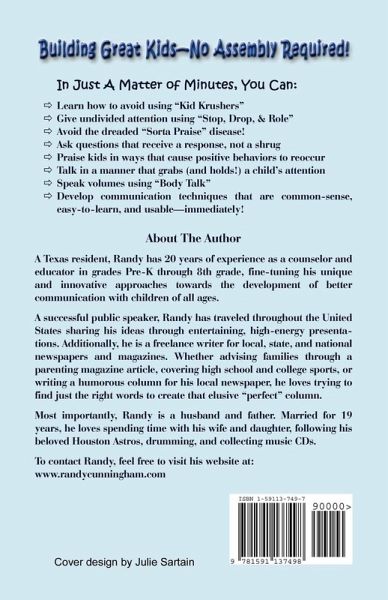 Building Great Kids-No Assembly Required! provides today's parents with common-sense, easy-to-learn, and immediately-usuable tips to develop great communication with their children. Building Great Kids makes a real difference in relationships...in a matter of moments!