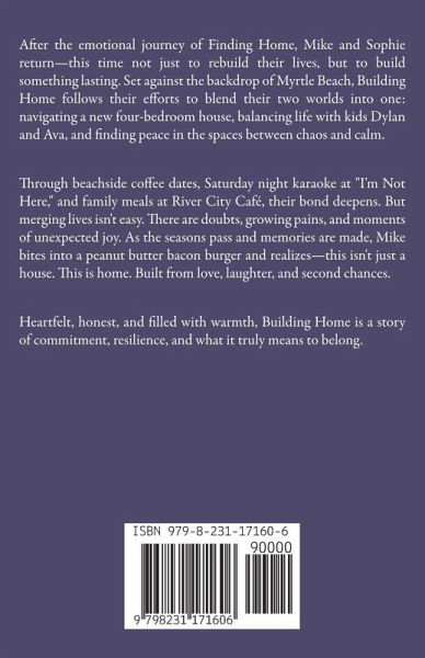 After the emotional journey of Finding Home, Mike and Sophie return-this time not just to rebuild their lives, but to build something lasting. Set against the backdrop of Myrtle Beach, Building Home follows their efforts to blend their two worlds into one: navigating a new four-bedroom house, balancing life with kids Dylan and Ava, and finding peace in the spaces between chaos and calm. Through beachside coffee dates, Saturday night karaoke at "I'm Not Here," and family meals at River City Café, their bond deepens. But merging lives isn't easy. There are doubts, growing pains, and moments of unexpected joy. As the seasons pass and memories are made, Mike bites into a peanut butter bacon burger and realizes-this isn't just a house. This is home. Built from love, laughter, and second chances. Heartfelt, honest, and filled with warmth, Building Home is a story of commitment, resilience, and what it truly means to belong.