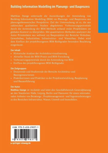 Matthias Stange untersucht die Auswirkungen der Anwendung von Building Information Modelling (BIM) im Planungs- und Bauprozess aus planungsökonomischer Perspektive. Ziel der Untersuchung ist es, die aus zahlreichen qualitativen Studien abgeleiteten Verbesserungspotentiale durch die Anwendung der BIM-Methode anhand realer Projektdaten im globalen Kontext zu überprüfen. Mit quantitativen Methoden analysiert der Autor Primärdaten aus weltweit 105 Bauprojekten der Bereiche Wohnbau, Gewerbebau, Industriebau, Infrastruktur- und Wasserbau. Dabei wird dem Einfluss des projektbezogenen BIM-Reifegrades besondere Beachtung eingeräumt.