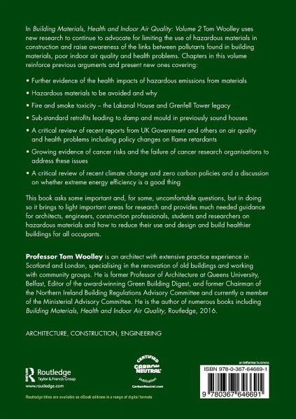 In Building Materials, Health and Indoor Air Quality: Volume 2 Tom Woolley uses new research to continue to advocate for limiting the use of hazardous materials in construction and raise awareness of the links between pollutants found in building materials, poor indoor air quality and health problems. Chapters in this volume reinforce previous arguments and present new ones covering: