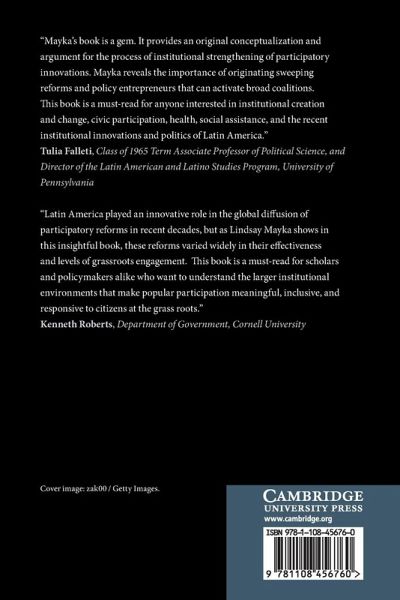 1. Introduction: the puzzle of participatory institution building; 2. Theoretical framework: participatory institution building through sweeping sectoral reform and policy entrepreneurs; 3. The origins of participatory reforms in Brazil and Colombia; 4. Brazil's health councils: successful institution building through sweeping reform; 5. Brazil's social assistance councils: the advances of a broad but divided coalition mobilized through sweeping reform; 6. Colombia's planning councils: the limits to participatory institution building without sweeping sectoral reform; 7. Colombia's health committees: failed participatory institution building in the absence of policy entrepreneurs; 8. Lessons for institutional change, interest representation, and accountability.