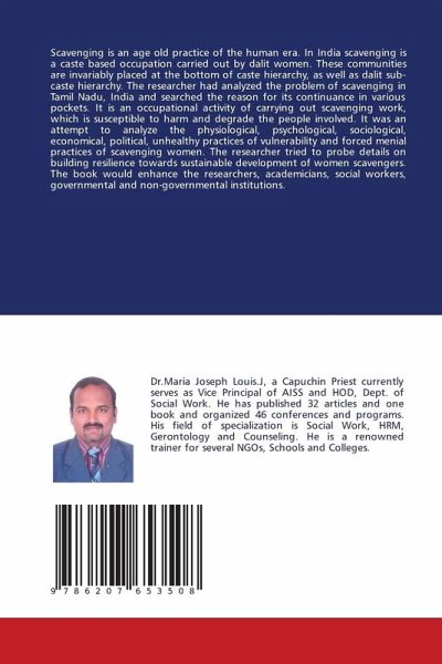 Scavenging is an age old practice of the human era. In India scavenging is a caste based occupation carried out by dalit women. These communities are invariably placed at the bottom of caste hierarchy, as well as dalit sub-caste hierarchy. The researcher had analyzed the problem of scavenging in Tamil Nadu, India and searched the reason for its continuance in various pockets. It is an occupational activity of carrying out scavenging work, which is susceptible to harm and degrade the people involved. It was an attempt to analyze the physiological, psychological, sociological, economical, political, unhealthy practices of vulnerability and forced menial practices of scavenging women. The researcher tried to probe details on building resilience towards sustainable development of women scavengers. The book would enhance the researchers, academicians, social workers, governmental and non-governmental institutions.