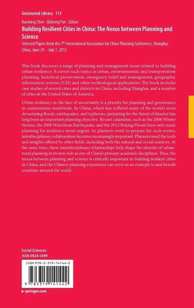 This book discusses a range of planning and management issues related to building urban resiliency. It covers such topics as urban, environmental, and transportation planning, historical preservation, emergency relief and management, geographic information systems (GIS) and other technological applications. The book includes case studies of several cities and districts in China, including Shanghai, and a number of cities in the United States of America.