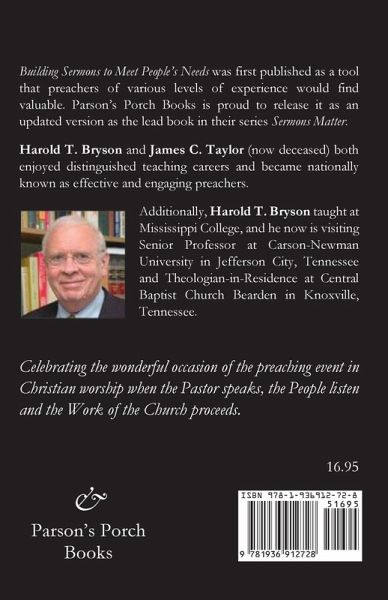 The origin of this book has kinship with the merging of two rivers. Two rivers existed side by side. One had flowed longer than the other river. It had received the water and rich deposits of rivers, creeks, and streams. The other river was formed later. The two rivers existed separately, but ultimately they merged. The water from the older river mixed with the younger river. Their waters became intermingled. As they flowed together, their waters blended thoroughly. Other tributaries flowed into the combined river, and this one river was filled with deposits from many sources. As the river flowed, it emptied its waters in a large gulf. If you looked at the river, you could not tell what water belonged to what river. This analogy fits the formation of this book. James C. Taylor resembles the description of the river which existed longer. He has been a pastor, a navy chaplain, and a seminary professor. He has taught preachers to build sermons for over three decades. Through these decades many streams of homiletical information flowed into his life and ministry -Charles W. Koller, George Buttrick, Andrew W. Blackwood, H. Grady Davis, John A. Broadus, Austin Phelps, Phillips Brooks, Halford Luccock, Ralph Sockman, and others. Students from several generations have learned from this teacher of preaching. They have observed the character of his life, and they have applied his techniques of building a sermon. Also, he has listened to their feedback; thus, he has been able to improve his content and method of teaching continuously. The other river in the analogy is Harold T. Bryson. His system of preaching was influenced by Taylor in an expository preaching class. Bryson listened to Taylor's theory of preaching and applied it in his student pastorate and in subsequent pastorates. He sought each week to build sermons with the idea of helping his people, according to the system shared by Taylor. Bryson served as a pastor for nineteen years. The mechanics of "building" a sermon to meet people's needs intrigued both men. Bryson, in the pastorate, and Taylor, in the seminary, shared ideas with each other. They listened to each other. They learned together about one system of building a sermon. They continuously insisted that the system of sermon construction must be subservient to helping people with their needs.