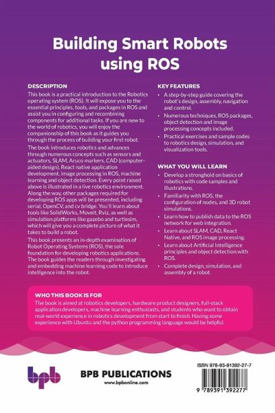 A beginner's guide to learn ROS, robotics platform, and practice building robotics system KEY FEATURES ¿ A step-by-step guide covering the robot's design, assembly, navigation and control. ¿ Numerous techniques, ROS packages, object detection and image processing concepts included. ¿ Practical exercises and sample codes to robotics design, simulation, and visualization tools. DESCRIPTION This book is a practical introduction to the Robotics operating system (ROS). It will expose you to the essential principles, tools, and packages in ROS and assist you in configuring and recombining components for additional tasks. If you are new to the world of robotics, you will enjoy the companionship of this book as it guides you through the process of building your first robot. The book introduces robotics and advances through numerous concepts such as sensors and actuators, SLAM, Aruco markers, CAD (computer-aided design), React native application development, image processing in ROS, machine learning and object detection. Every point raised above is illustrated in a live robotics environment. Along the way, other packages required for developing ROS apps will be presented, including serial, OpenCV, and cv bridge. You'll learn about tools like SolidWorks, Moveit, Rviz, as well as simulation platforms like gazebo and turtlesim, which will give you a complete picture of what it takes to build a robot. WHAT YOU WILL LEARN ¿ Develop a stronghold on basics of robotics with code samples and illustrations. ¿ Familiarity with ROS, the configuration of nodes, and 3D robot simulations. ¿ Learn how to publish data to the ROS network for web integration. WHO THIS BOOK IS FOR The book is aimed at robotics developers, hardware product designers, full-stack application developers, machine learning enthusiasts, and students who want to obtain real-world experience in robotics development from start to finish. Having some experience with Ubuntu and the python programming language would be helpful