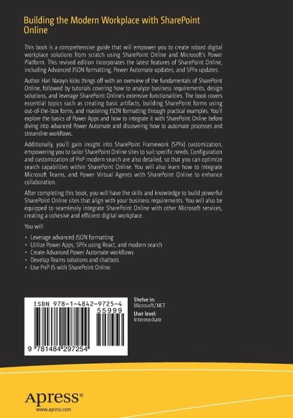This book is a comprehensive guide that will empower you to create robust digital workplace solutions from scratch using SharePoint Online and Microsoft's Power Platform. This revised edition incorporates the latest features of SharePoint Online, including Advanced JSON formatting, Power Automate updates, and SPFx updates. Author Hari Narayn kicks things off with an overview of the fundamentals of SharePoint Online, followed by tutorials covering how to analyze business requirements, design solutions, and leverage SharePoint Online's extensive functionalities. The book covers essential topics such as creating basic artifacts, building SharePoint forms using out-of-the-box forms, and mastering JSON formatting through practical examples. You'll explore the basics of Power Apps and how to integrate it with SharePoint Online before diving into advanced Power Automate and discovering how to automate processes and streamline workflows. Additionally, you'll gain insight into SharePoint Framework (SPFx) customization, empowering you to tailor SharePoint Online sites to suit specific needs. Configuration and customization of PnP modern search are also detailed, so that you can optimize search capabilities within SharePoint Online. You will also learn how to integrate Microsoft Teams, MS Graph, and Power Virtual Agents with SharePoint Online to enhance collaboration. After completing this book, you will have the skills and knowledge to build powerful SharePoint Online sites that align with your business requirements. You will also be equipped to seamlessly integrate SharePoint Online with other Microsoft services, creating a cohesive and efficient digital workplace. What You Will Learn Leverage advanced JSON formatting Utilize Power Apps, SPFx using React, and modern search Create Advanced Power Automate workflows Develop Teams solutions and chatbots Use Microsoft Graph and PnP JS with SharePoint Online Who This Book Is For All SharePoint developers and power users.
